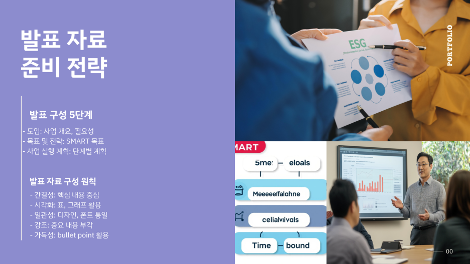 - 일관성: 발표 자료의 디자인, 폰트, 색상을 통일감 있게 유지