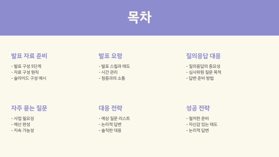 이 장에서는 효과적인 발표 자료 준비와 발표 요령, 그리고 심사위원의 질문에 유연하게 대응할 수 있는 질의응답 대응 전략을 구체적으로 다루겠습니다.