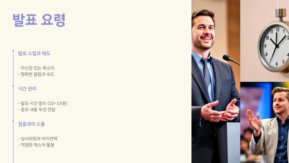- 청중과의 아이컨택: 심사위원과 시선을 맞추며 자연스러운 발표
