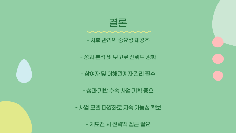 따라서 사업 종료 후에도 철저한 관리와 후속 조치를 통해 성과를 유지하고 확장할 필요가 있습니다.