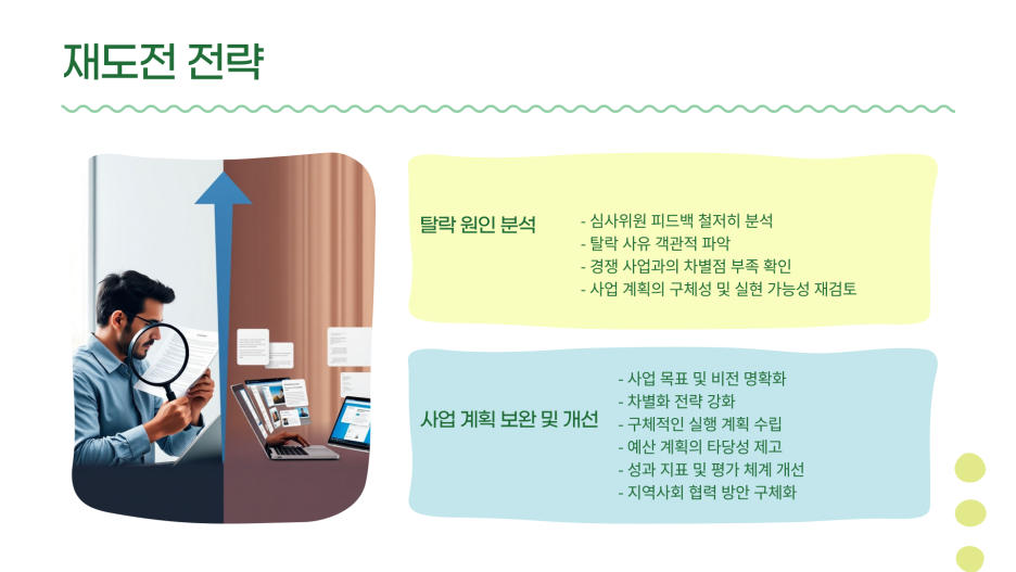 공모사업에서 떨어졌더라도 이를 발판으로 재도전 전략을 세워야 합니다.