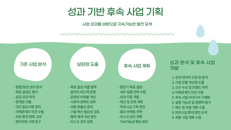 성과를 바탕으로 후속 사업을 기획하여 지속 가능한 사업 모델을 개발합니다.